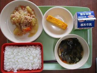 〈メニュー〉ごはん 牛乳 肉じゃが 厚焼き卵 大根とわかめの味噌汁