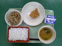 ごはん ぎゅうにゅう ポテトとおこめのささみかつ ごもくきんぴら いなかじる