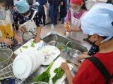 栄養教諭からジャガイモの芽の取り方を教わって、しっかり取り切ることができました。青菜とジャガイモはゆで加減が違うので、みんな「もう大丈夫かな。」とドキドキしていました。
