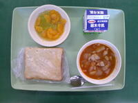 ごはん ぎゅうにゅう ユーリンチー こまつなとコーンのサラダ ワンタンスープ
