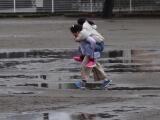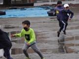 朝の雨も休み時間には止みました。低中学年の子どもたちは、水たまりのできた校庭に集まってきました。