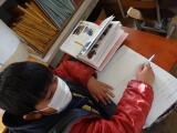 タブレットを受け取ると、操作が得意な子はどんどん自分でログインできました。不安な子は先生や友達に聞きながら学習用アプリ「eライブラリ」を始めました。
