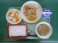 ごはん ぎゅうにゅう いかてんどんのぐ・たれ こまつなのうめあえ じゃがいもとわかめのみそしる