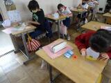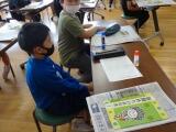 今週は、業間の時間を使って、学年ごとに決められた役割でプレゼントづくりに取り組んでいます。6年生は、型抜きで星やクローバーなどのかざりを作りました。5年生は、メッセージカードの台紙を作りました。どの子も、1年生を喜ばせようとがんばっていました。