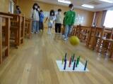 次に、レクリエーションとして「自己紹介ボーリング」をしました。ペンのピンをボールを転がして倒します。チームを2つに分けて、点数を競いました。得点の少ない方がくじを引いて、自己紹介のテーマを決めます。「好きな食べ物」「今がんばりたいこと」など、お互いの話を聞いて、さらになかよくなりました。