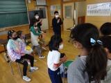 最後に、歯みがきは、歯だけでなく歯茎の健康にも注意して行うことを知って、歯ブラシとデンタルブロスを組み合わせた歯みがきの仕方を練習しました。感染症予防のため、実際の歯みがきはできませんでしたが、意識は高まっていました。ぜひ、ご家庭でも練習の成果ができるように声をかけてください。