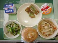 ミニアップルパン ぎゅうにゅう にこみうどん ちくわのいそべあげ こまつなのおひたし アセロラゼリー