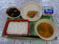 キラキラごはん 牛乳 とりにくのからあげ だいずのいそに じゃがいもとさやえんどうのみそしる