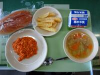 せわりコッペパン ぎゅうにゅう ミートさんどのぐ フライドポテト ひよこまめのスープ