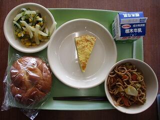 〈メニュー〉ミニアップルパン 牛乳 チーズ入りスペイン風オムレツ 茎わかめ入りサラダ イカ入り焼きそば