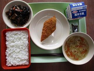 〈メニュー〉ごはん 牛乳 白身魚フライ・ソース ひじきの炒め煮 うどのかき玉汁