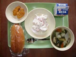 〈メニュー〉コッペパン 牛乳 いちごクリームサンドの具 チキンナゲット ワンタンスープ