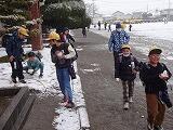 1~3年生の下校時には、少し降る量が減ってきましたが、子どもたちは雪を見ると自然と触りたくなったようです。学年下校の1~3年生は、6年生のお兄さんお姉さんが雪遊びを始めたのを見て、小さな雪玉を作ってニコニコしていました。