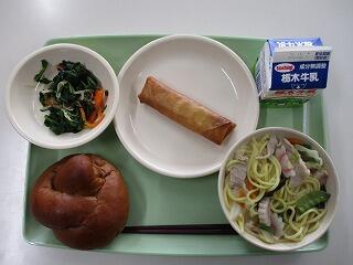 〈メニュー〉ミニくろパン 牛乳 春巻き 中華サラダ チャンポン麺