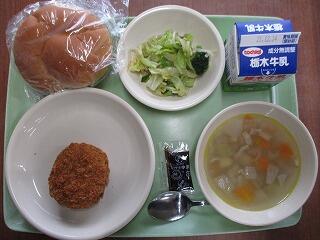 〈メニュー〉メンチカツバーガー(まるパン・メンチカツ) 牛乳 キャベツとブロッコリーのサラダ ひよこまめのスープ
