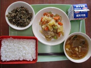 〈メニュー〉ごはん 牛乳 肉じゃが 手作りじゃこふりかけ 大根の味噌汁