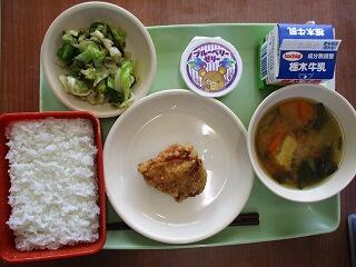 ごはん 牛乳 鶏肉の唐揚げ ひめきゅうりとキャベツの昆布漬け なまあげの味噌汁 ブルーベリーゼリー
