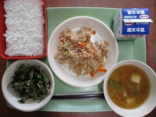 〈メニュー〉ごはん 牛乳 ビビンバの具 チンゲンサイと卵のスープ 野菜サラダ