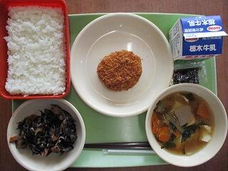 〈メニュー〉ごはん 牛乳 メンチカツ いなかじる ひじきのにもの