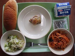 〈メニュー〉コッペパン・とちおとめジャム 牛乳 鶏肉のハーブ焼き なすとトマトのスパゲティー キャベツともやしのサラダ