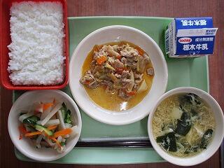 〈メニュー〉ごはん 牛乳 ぶたキムチ丼の具 わかめと卵のスープ 即席漬け