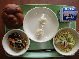 〈メニュー〉ミニ黒パン 牛乳 エビしゅうまい チャンポンメン 中華和え
