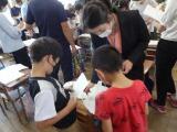 子どもたちは、実際に点字を打ちながら「すごい集中した!!」「やった!!できた!!」と喜んでいました。自分で打ちたい言葉を探して打つことはとても難しいことでしたが、ボランティアの方々がやさしく教えてくださり最後までがんばることができました。