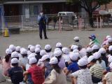 校庭に避難した後、警察の方々からお話を聞き、「いかのおすし」の対応の大切さを学びました。