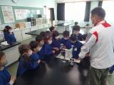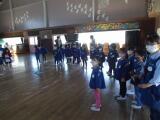 園児の皆さんは、3つの班に分かれて校内を見学しました。音楽室では、いろいろな楽器に驚きました。図工室や理科室では、見たことがないものがたくさんあって興味をもちました。図書室では、読んでみたいという声が出ました。体育館では4年生がマット運動しているのを見て「すごい。」と言ってくれました。