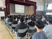 1日目の練習では、学年主任から卒業式に向けてのお話がありました。昨年度の卒業式の様子を思い出してもらうために、映像を見せます