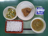 ごはん ぎゅうにゅう あじフライ ゆでやさいサラダ だいずのカレースープ