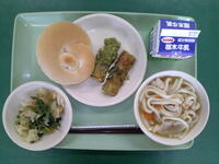 【八十八夜メニュー】ミニミルクパン ぎゅうにゅう ちくわのしんりょくあげ おひたし きつねうどん