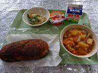 今日は、とちぎ国体・障スポ応援メニューです。みなさんの大好きなココア揚げパンやインド煮が出ています。インド煮は、ぶた肉やじゃがいも、野菜などをケチャップとカレー粉を使って煮込んだ料理です。スポーツに役立つたんぱく質やビタミンが豊富な料理です。くわしくは、ちょこっと食通信を見てください。