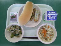 ミニコッペパン いちごジャム ぎゅうにゅう にこみうどん ちくわのいそべあげ こまつなのおひたし