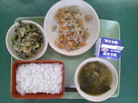 ごはん ぎゅうにゅう おさかなどんのぐ こまつなのいそかあえ だいこんとわかめのみそしる