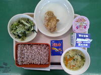 今日は、6年生の卒業祝いこんだてで、赤飯が出ています。6年生の卒業を、みんなでお祝いしましょう。
