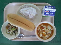 せわりコッペパン ぎゅうにゅう いちごクリームサンドのぐ チンゲンサイのソテー ミネストローネスープ
