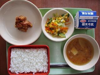 〈メニュー〉ごはん 牛乳 鶏肉の唐揚げ 大根の味噌汁 和風サラダ