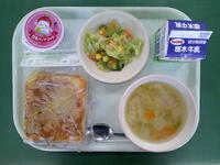 今日は、イタリアの料理を紹介します。「ピッツア」は、イタリア生まれの料理です。小麦粉で作った薄い生地に、トッピングを乗せてチーズをかけて焼いたものです。それがアメリカに伝わり、ふわふわの厚い生地で作った「ピザ」が誕生しました。日本のピザは、アメリカの影響を受けて広まったようです。今日は、給食風に作ったピザトーストです。また、デザートには、イタリア発祥のパンナコッタが出ています。料理が世界中を旅しているようですね。いろいろな国の料理を調べてみましょう。