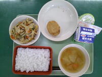 今日は、たけのこを使ったたけのこごはんです。具をごはんに混ぜて食べてください。たけのこには、おなかの働きを整える食物せんいが豊富です。