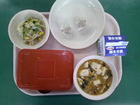 今日は、みなさんの大好きなマーボーどうふです。この料理の名前は、「マーおばあさんが作った料理」という意味で、中国の料理です。トウバンジャンというピリ辛味の香辛料を使っています。寒い時期に、体が温まる豆腐料理です。