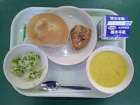 まるパン ぎゅうにゅう チキンたつたサンドのぐ ゆでやさい・タルタルソース かぼちゃのポタージュ