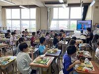 校長室で、給食の試食をしていただきました。栄養教諭の先生に、給食の献立について説明していただき、皆さん、とてもおいしいと召し上がっていました