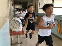 【陸上練習】最初は校庭での練習をおこないましたが、朝から気温が上昇し、23日(火)の練習時に、体調不良者が出てしまったため、室内での練習に切り替えました。普段は「走ってはいけない廊下」を、思う存分走ってトレーニング休憩と水分補給をこまめにしながら練習しています