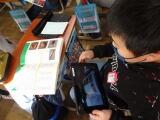 4年生は、社会科の伝統工芸品について調べる学習で、タブレット端末を使って情報を集めたり、図書資料を撮影して必要な情報を選んだりしていました。