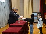 令和5年度1年間のまとめとして修了式を行いました。まず、5年生から順番に各学級の代表の子どもたちに校長先生から終了証を手渡しました。