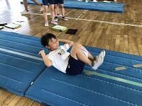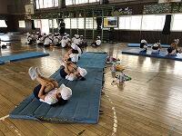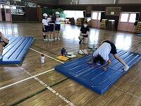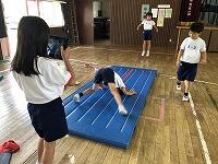 星体育館で「マット運動」の授業でした。「チームで協力して、後転系の技を身につけよう」というめあてで学習しました。