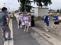 これまで、プール南側の門から学校に入っていましたが、中学生の通行(西から東へ)と児童の通行(東から西へ)が重なること、自動車の通行が多く、道幅も狭いことから、児童の入校口を東門に変更することにしました。しばらくは、教職員が立哨し、対応いたしますひらめき