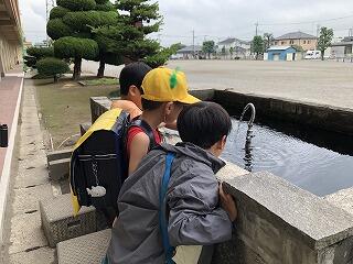 登校してくると、1年生の子どもたちが、何やら池の周りに集まっているので、一緒にのぞいてみると・・・