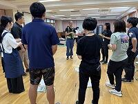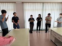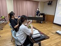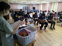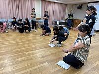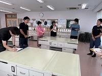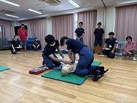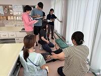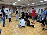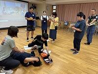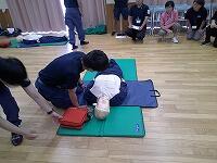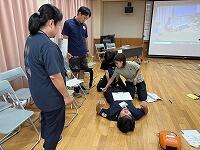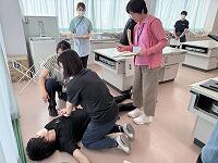 養護助教諭の先生を中心に、実技演習を用いて行いました。緊急時を想定して、2つの事例を動きながら確認し、グループごとに、消防署の方にご指導いただきました。